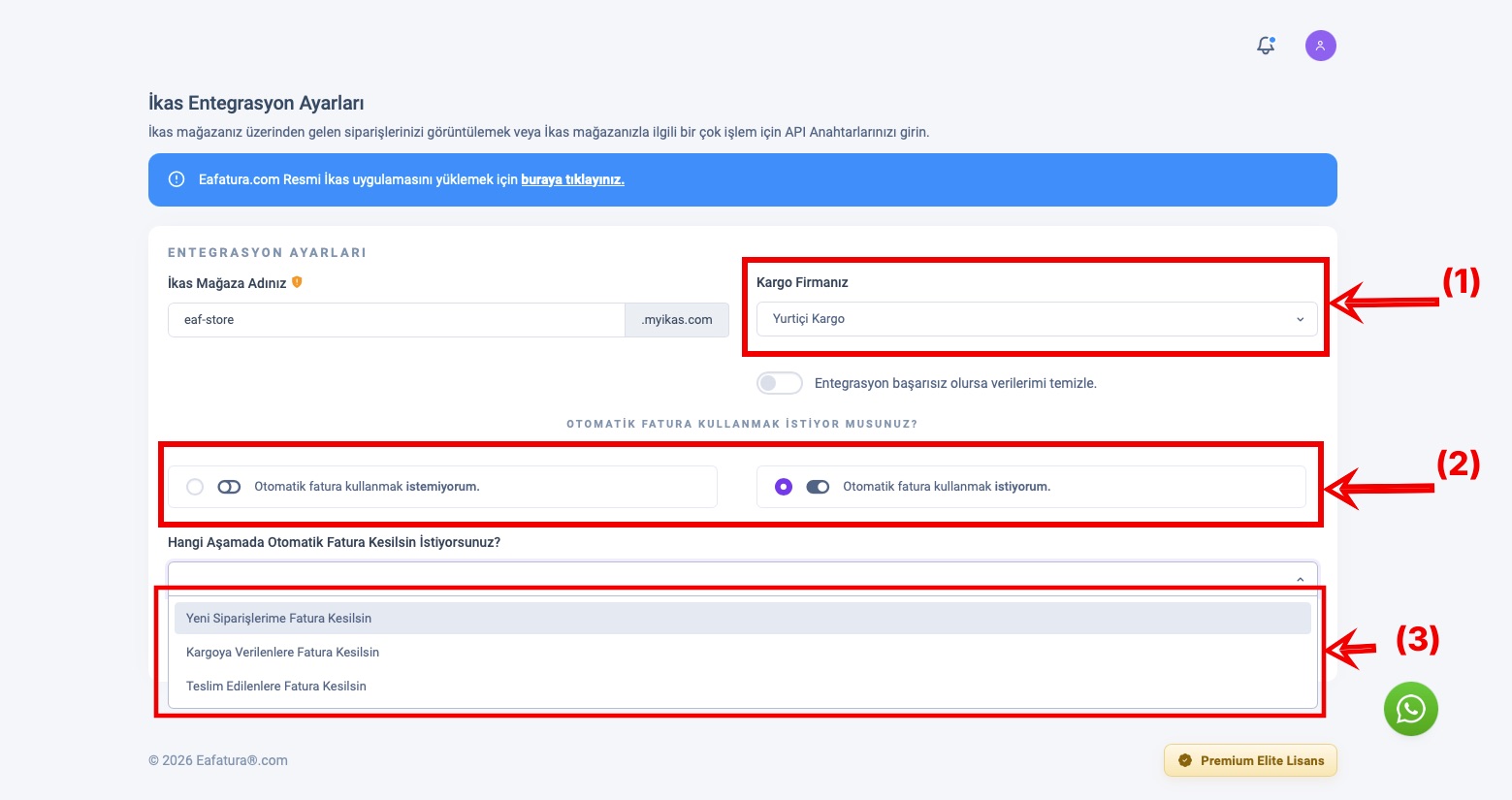 Uygulama kurulumu tamamlandıktan sonra, basit ayarlarınızı yapabileceğiniz Eafatura.com ikas sayfasına yönlendirileceksiniz.