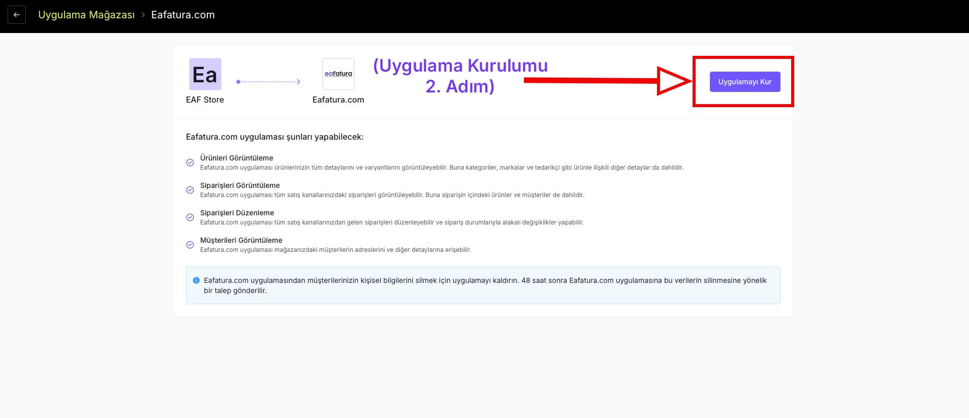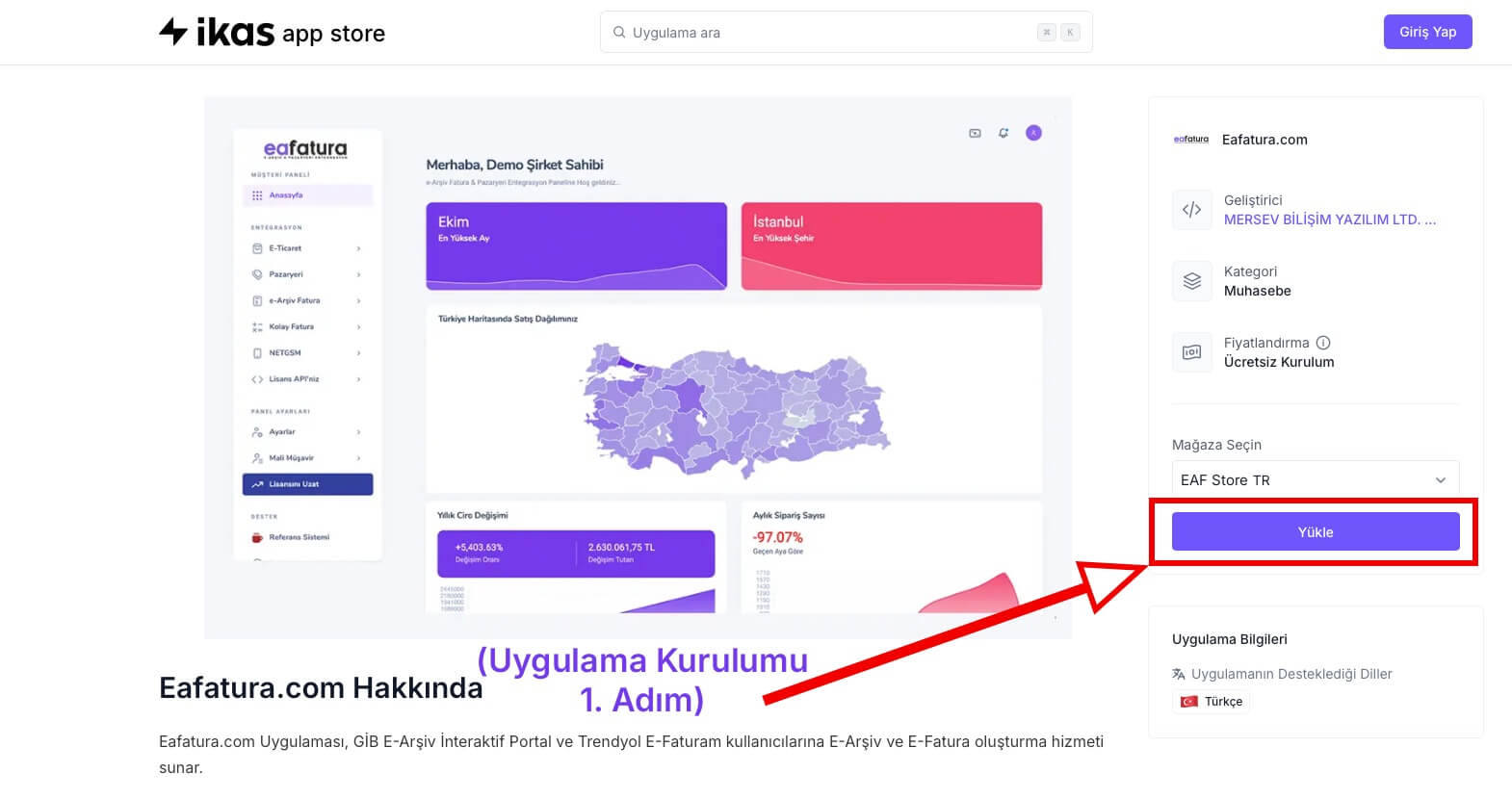 Adım 2 Kolay: Direkt olarak Eafatura.com ikas AppStore Uygulaması bağlanısına tıklayarak kurulum yapabilirsiniz..